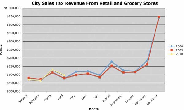 The recession caused a significant dip in retail sales and therefore in retail sales tax revenue. The revenue for the retail/grocery category in the fiscal year ending Sept. 30, 2009, was nearly 3 percent less than the previous fiscal year. But the latest data provided by the city shows an upswing after a two-year decline.