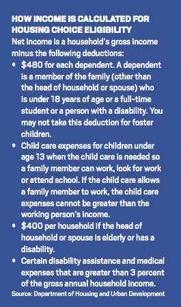 Eligibility for Housing Choice Vouchers is based on several criteria; chief among them is a household’s net income. That net income is further adjusted by certain deductions based on the number of children, elderly and disabled people in the household. The goal of the tenant-based vouchers is that eligible families only pay 30 percent of their income on housing, and the remaining rent is paid with government funds.