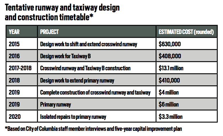 The proposed renovation would carry a multimillion-dollar price tag, with runway and taxiway improvements that are tentatively slated to begin next year expected to cost more than $27.8 million over the next several years. Most of the bill — 90 percent of it — would be footed by the Federal Aviation Administration, with the remainder financed by Columbia’s transportation sales tax, according to city officials. Having approved Columbia’s airport master plan and the improvements it envisions, the FAA, Sapp says, has signed off on the proposed projects and will consider financing 90 percent of their cost as its funding allows.