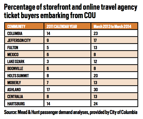 COU enplanements began an ongoing climb in 2009 following a significant dip in 2007 and 2008 that reflected changes in the airport’s carriers and service. With American Airlines offering two daily flights to and from both Chicago’s O’Hare International Airport and the Dallas/Fort Worth International Airport, planes have been flying about 85 percent full throughout this year, city officials say. The upward trend is visible in the number of COU enplanements. In 2007, the city recorded 9,090 passengers boarding COU flights; by 2013, some 43,178 passengers took off from Columbia’s airport. COU airport manager Don Elliott predicts the number of enplanements this year will exceed 50,000.