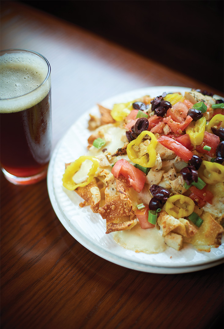 Italian pasta chips topped with Asiago cheese sauce; tomatoes; scallions; kalamata olives; banana peppers; mozzarella cheese; and chicken, black beans, or chorizo sausage.