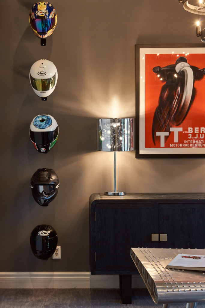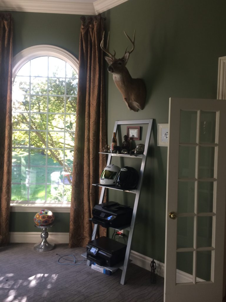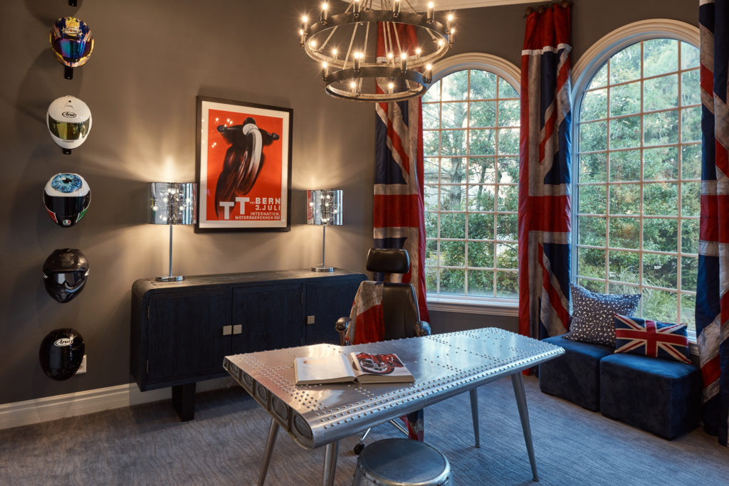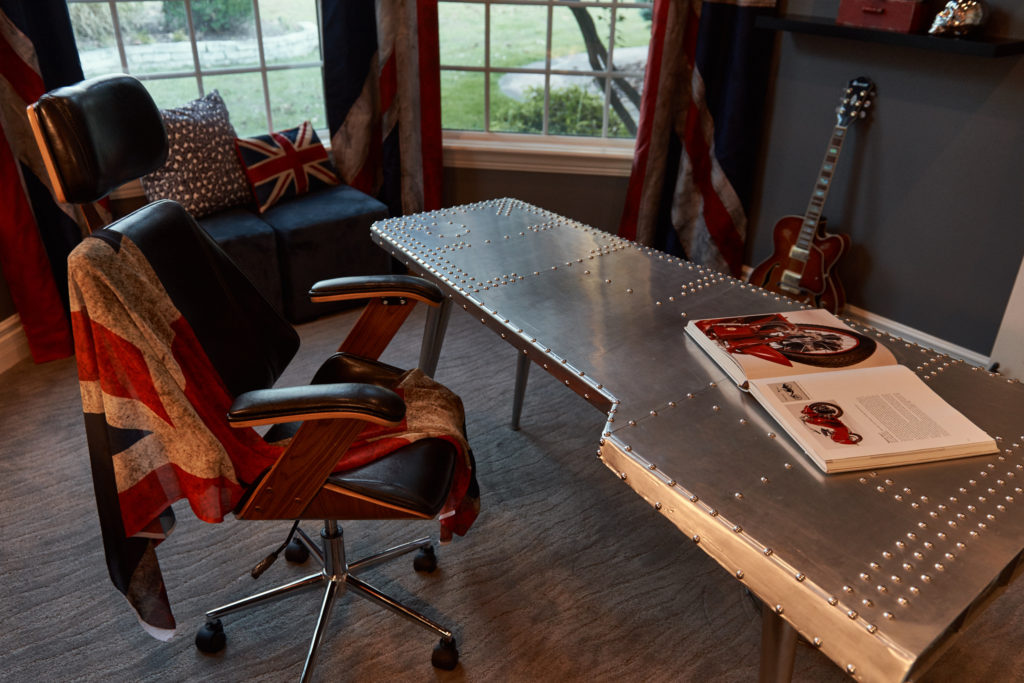 Over the course of the six weeks, the traditional room was transformed into a steampunk-inspired escape. The talented Jeff White, of Midwest Remodeling, used Benjamin Moore’s Aura paint to convert the neutral green walls to a steel gray and created a pop of color with a dark blue ceiling. I lugged out Paul’s old wooden desk and replaced it with a sleek, aviator-inspired table. The mundane, heavy beige drapes were replaced with faux-weathered British flags that I created and sewed into drapes (easier said than done). A large, rustic chandelier now fills the center of the room with the soft glow of LEDs. I completed the look with a simplistic, modern rack to display his helmets.