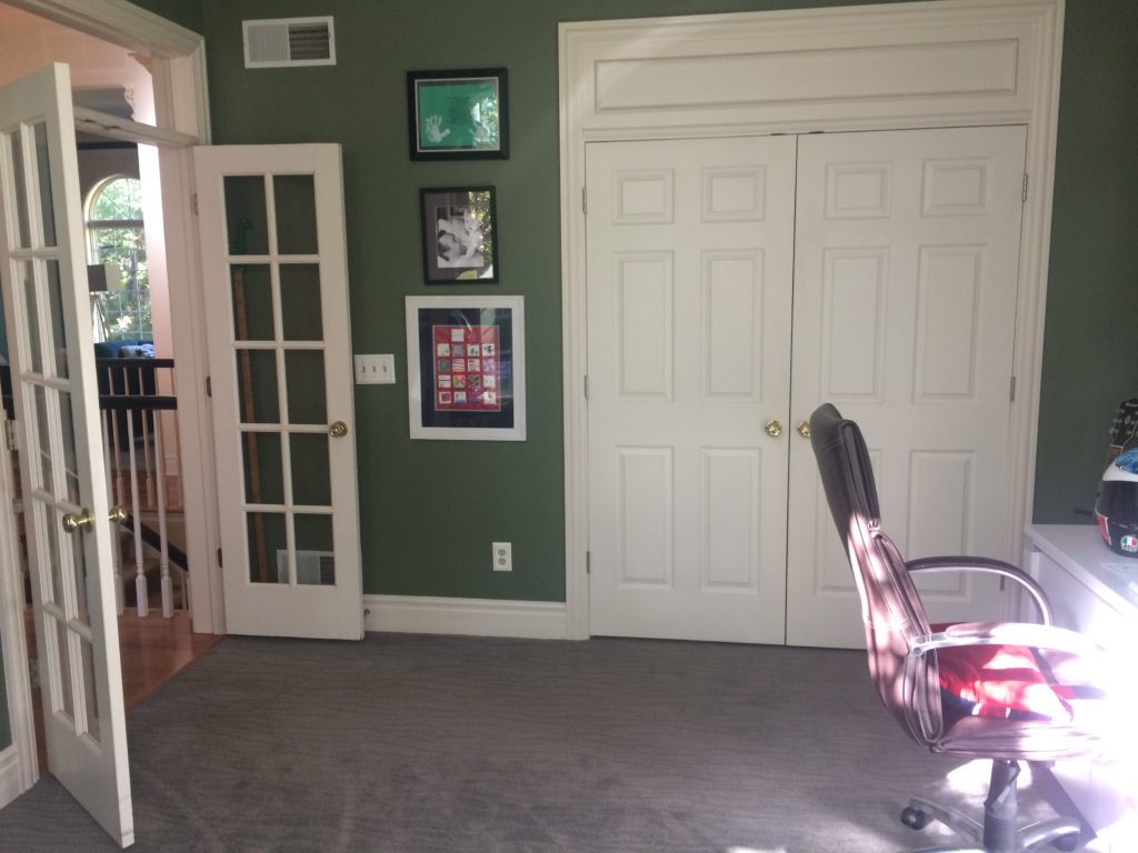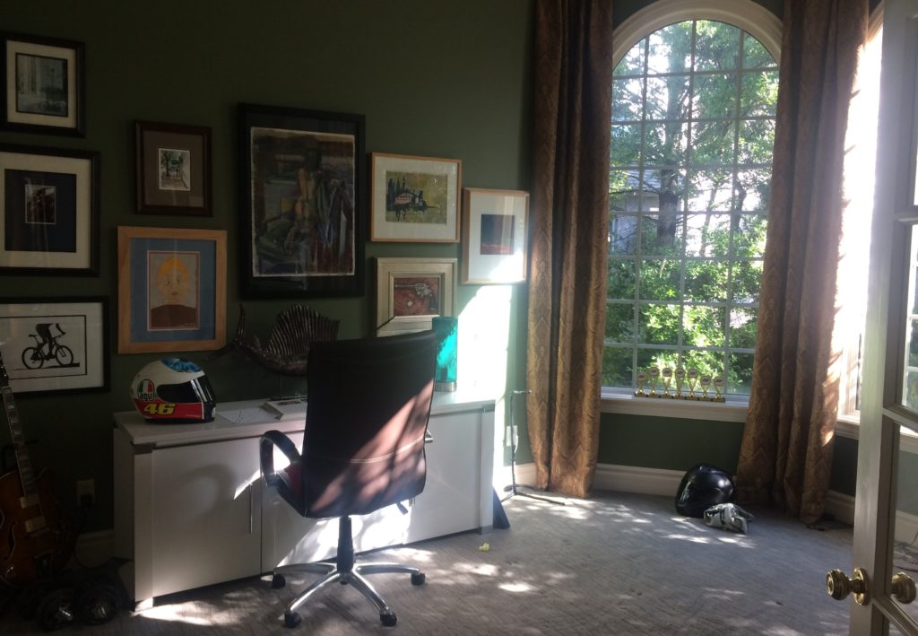 I selected my husband’s home office as the sacrificial lamb for the renovation. My husband, Paul, is a hard-working, talented, and adventurous man, and his office was, well, office-like. It was a relatively traditional and conservative space, which was not reflective of my motorcycle-racing Brit.