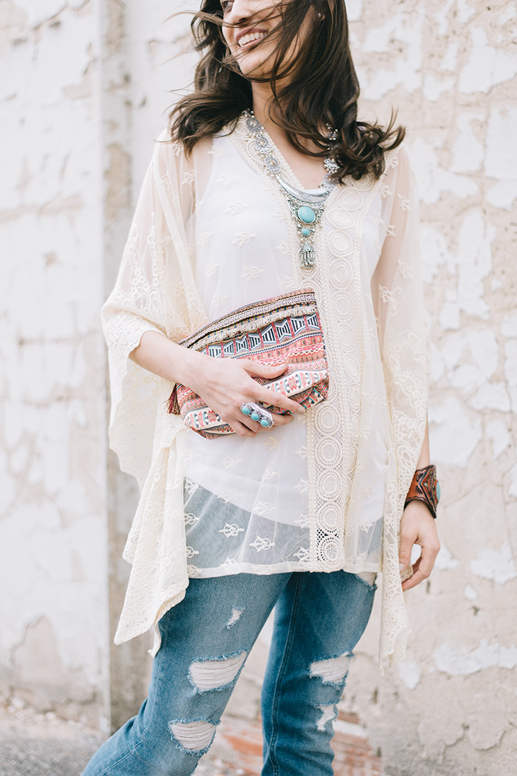 This outfit features a lace embroidered poncho paired with distressed Joe’s Jeans. It’s accented with a small patterned clutch, a turquoise decorative necklace, and a coordinating handmade tooled leather bracelet by Gemini Mermaid.