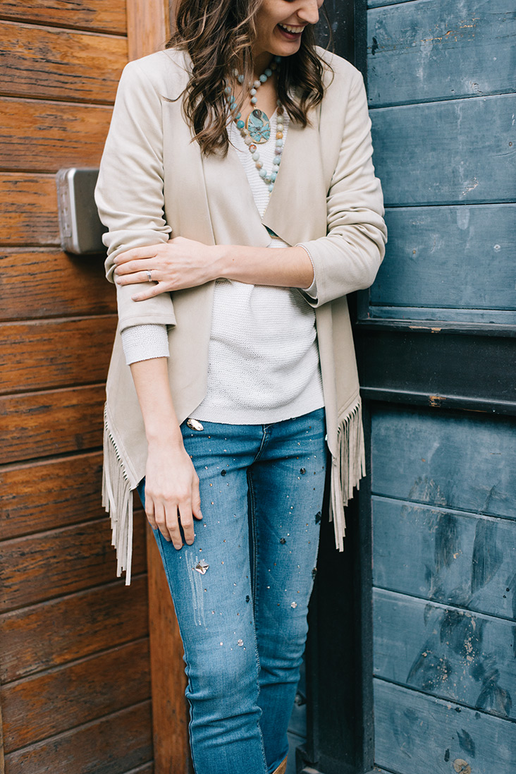 This look offers a touch of western flair with a neutral fringe cardigan by Cartise that hangs over a soft under-sweater by Nic + Joe. The outfit is paired with chunky turquoise necklaces by Two’s Company and light denim jeans by Cartise, with gold gems for an extra embellishment.