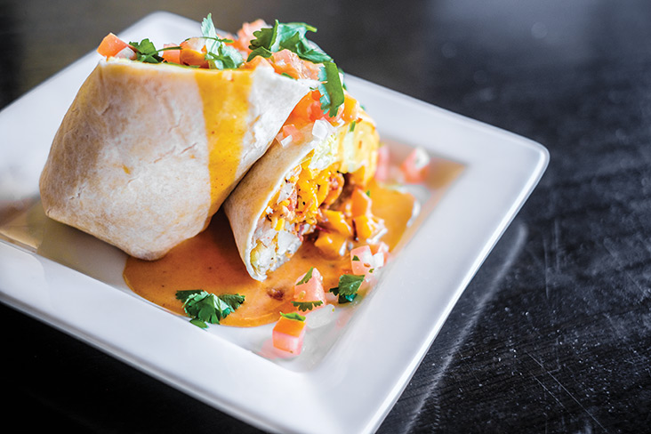 Flour tortilla stuffed with eggs, bacon, sausage, roasted potatoes, pico de gallo, and cheddar. Garnished with chipotle hollandaise.