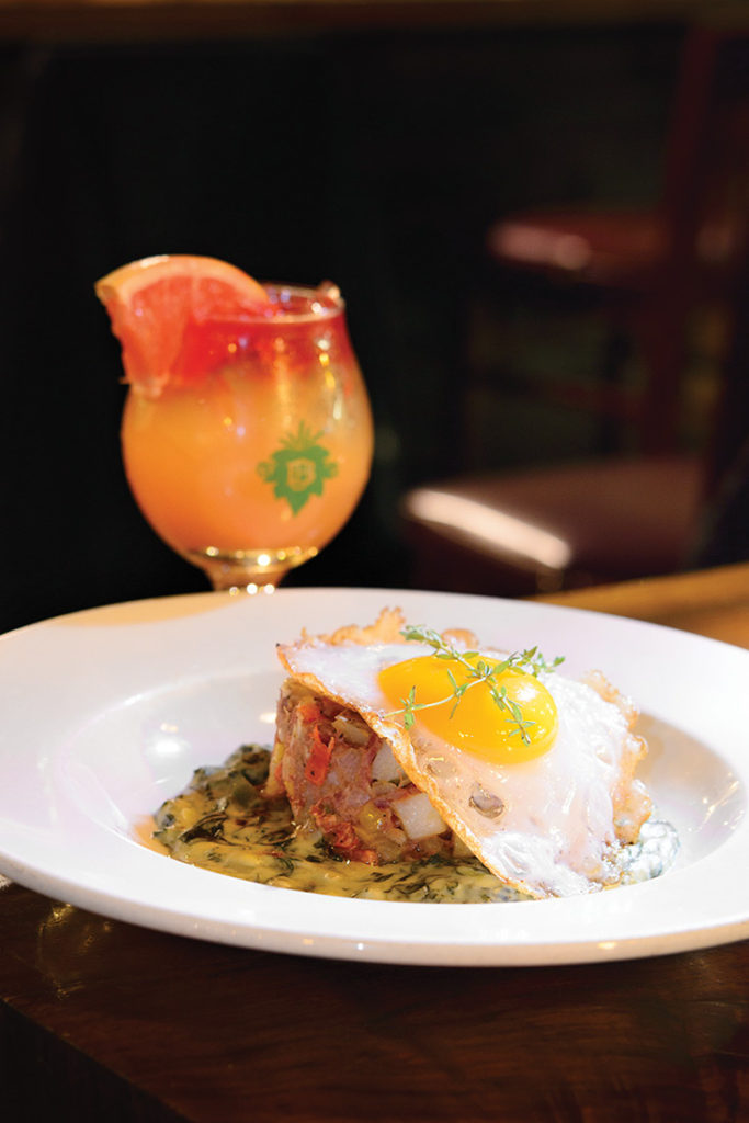 A traditional corned beef hash with potatoes, peppers, and onions, all served atop a bed of creamed greens and topped with a local farm-fresh duck egg.