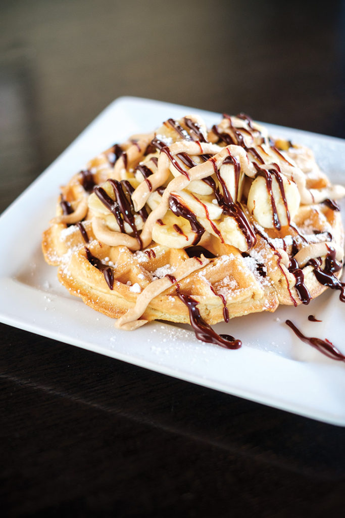 Belgian waffle topped with chocolate, peanut butter, and banana. Served with bacon maple syrup.