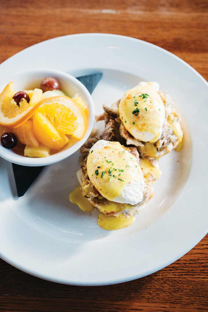 Biscuit base topped with smoked pulled pork, poached eggs, and hollandaise sauce.