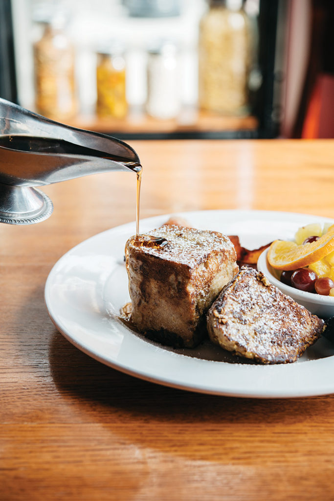 Cranberry walnut pain perdu with maple bacon syrup. Served with bacon or sausage.