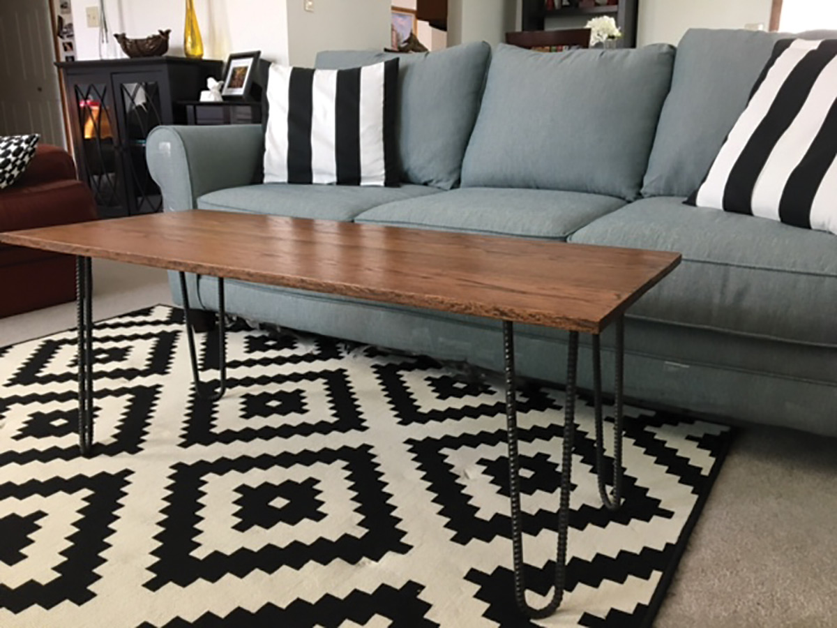 I enlisted the help of my grandpa, who is skilled with woodworking tools. First, I measured the height and length of my couch. I got three four-foot oak boards, and my grandpa used a biscuit joiner to cut the slots and add biscuits between each board to create a level surface. We used wood glue and clamps to glue the entire table top together and left the clamps on for 48 hours. Then we sanded the top and stained the wood, and I added a clear-coat spray paint finish, which was light and left the wood looking natural. Referencing the couch height measurements, I ordered the rebar legs from an online store.