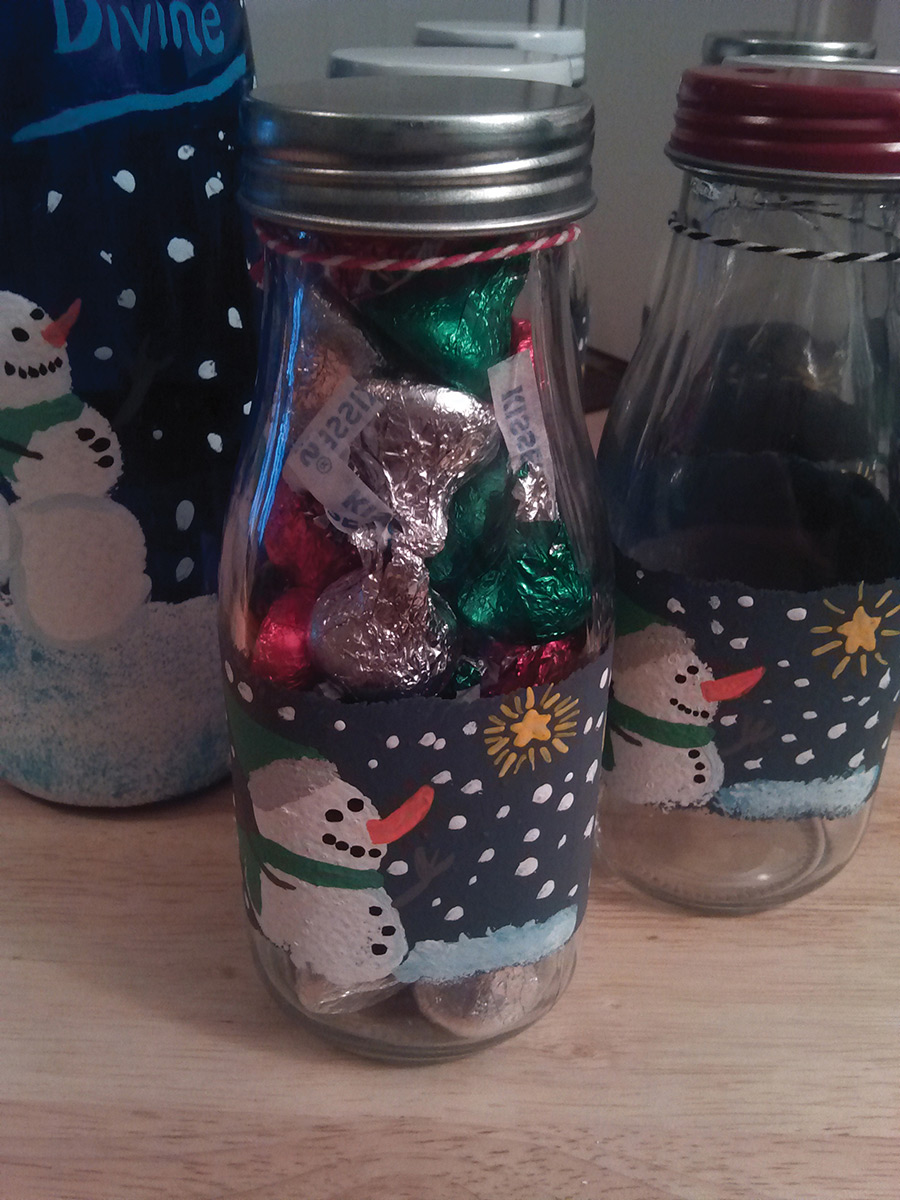 Using acrylic paint, decide on a design. Wine bottles are great for sharing your favorite quote or creating holiday décor. (They can also double as flower vase.) Recycling frappe bottles and glass milk bottles also makes for a great project or gift. You can fill the bottles with candy, paperclips, or even rubber bands.