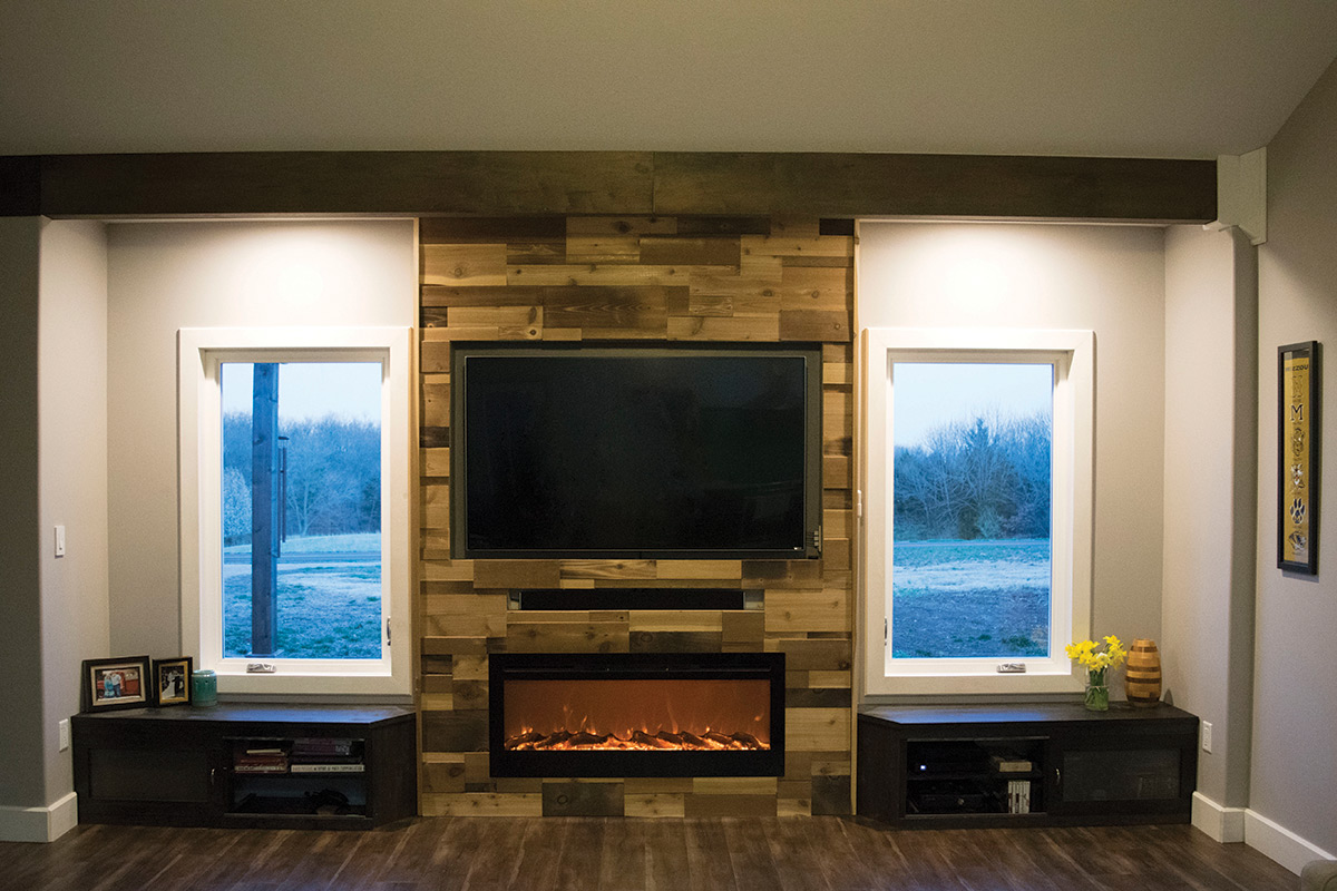 When building our house, we wanted a knock-out centerpiece for the living room, so we decided to build out a “media wall.” We started by framing the area against our exterior wall, between our large front windows and running electric. Drywall, tape, and mud, followed by paint, moved it closer to completion.