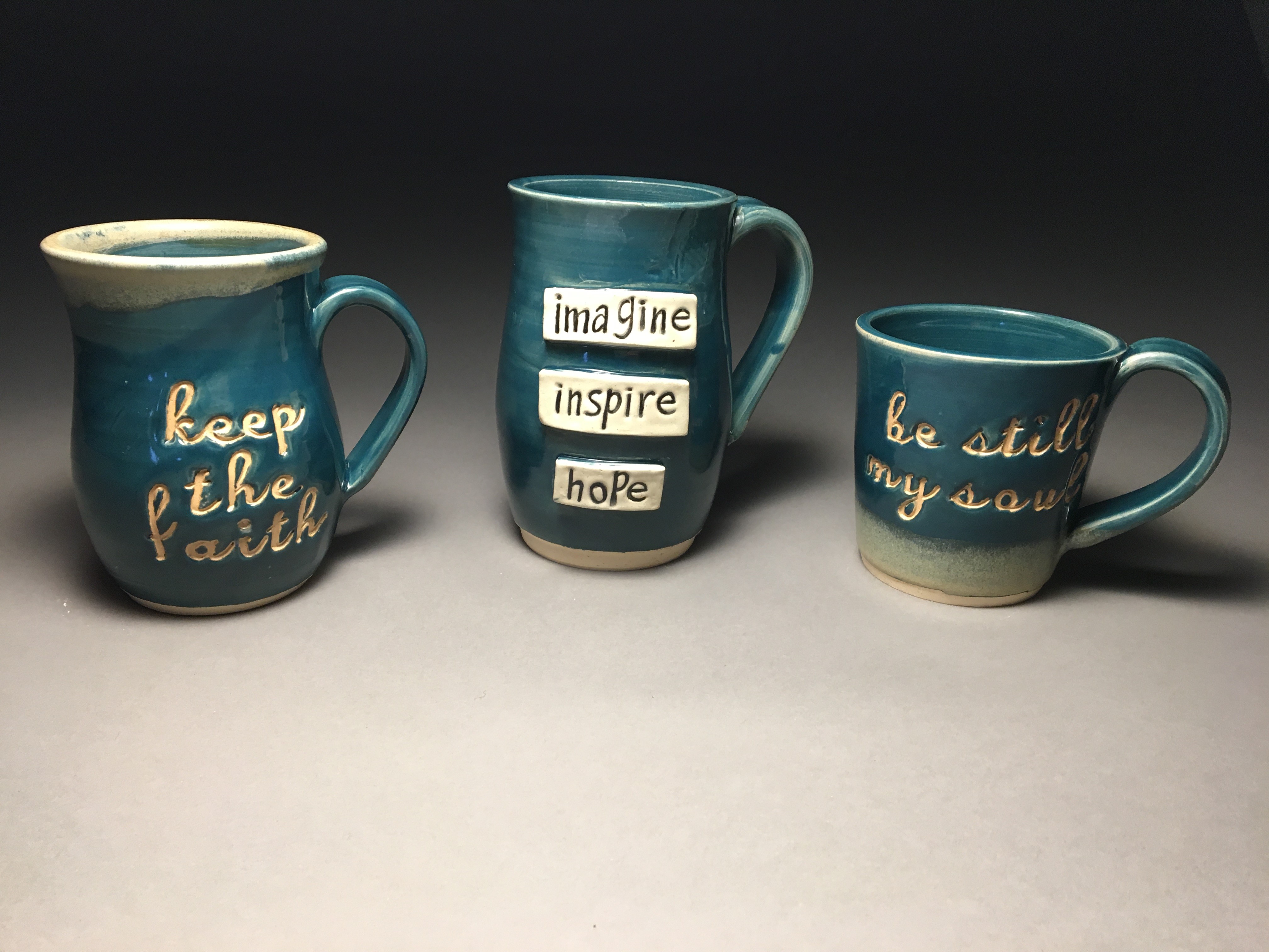 Along with creating pieces that hold symbolic meaning for Angie, she also creates pieces for others to use and enjoy. “I like when I can hold a mug that fits nicely in my hand and is pleasing to look at,” Angie says while describing the different mugs she creates. Her work incorporates some common themes: trees, inspired after her dad’s passing; messages centered on faith or spirituality; and the emotions evoked by each piece.