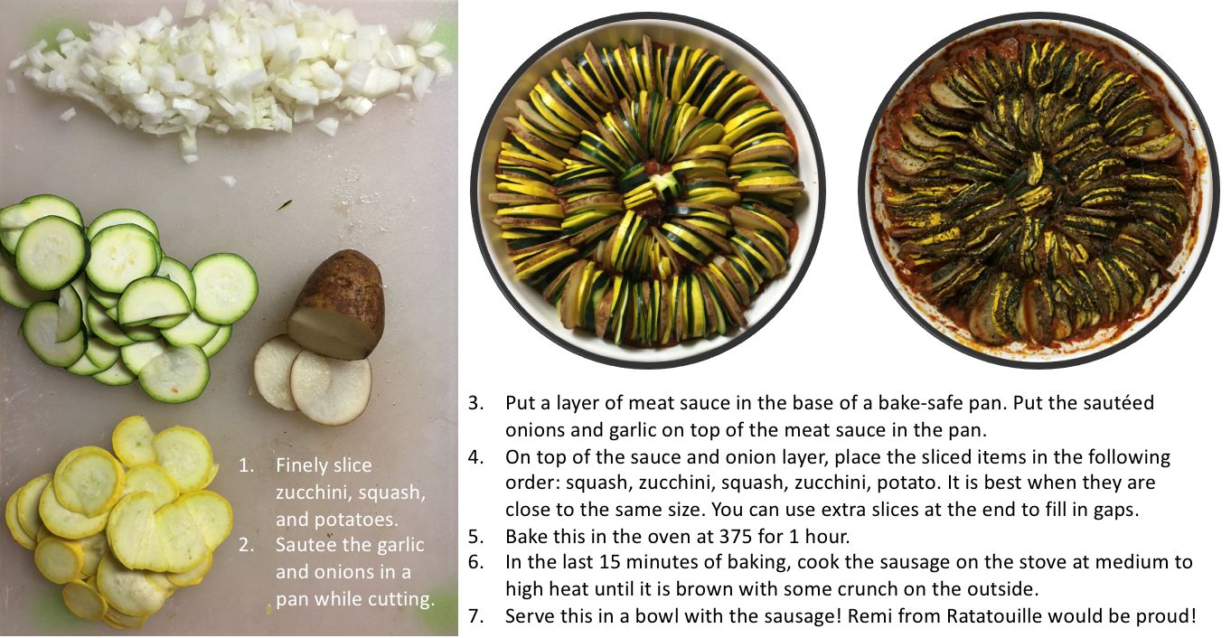 So I decided to pick up the ingredients for ratatouille (the French dish the movie takes its name from and which plays an integral role in the movie’s plot) from the store and come up with a recipe to mimic the end of the movie. I made it and it baked while we watched the movie. We loved it so much that we decided to meal prep it the following week, and it passed the ultimate test: it reheats well! This recipe takes a little bit of time to prepare, but it is definitely worth the work for this wonderfully deep flavor. All it requires is a lot of cutting, which the future surgeon in me loves, and some patience while cooking.