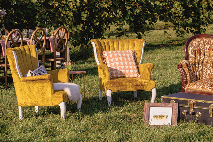 “I always recommend a lounge setting for all types of outdoor parties,” says Emma Wacker, owner of E. Clare Vintage. “The vintage furniture complements outdoor spaces so well, and they are so cozy and inviting, no matter what the outdoor scenery may be.”