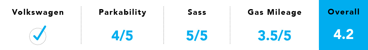 This is a big winner on the sass scale. It has the keyless system I liked. The leather was luxurious. The media panel and navigation system became somewhat addicting over the two days that I had the car. This car practically drives itself with the adaptive cruise control and blind spot monitor. Additionally, there is front, rear and lane assist that are really cool. Lastly, the cup holder is finally the perfect size for my coffee mugs. Even though it’s not as speedy as my Passat, I definitely give it a 5/5 for sass!