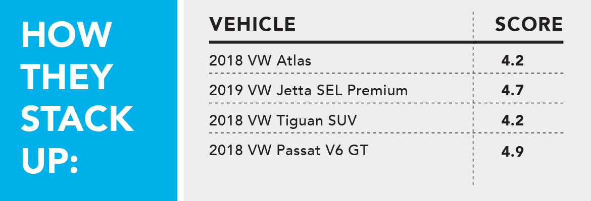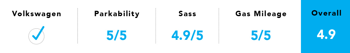 I give it a 4.9. This Passat GT was made for a girl like me looking for sass. In fact, it maybe even had more than I could handle. It, of course, has the 3.6 V6 that I neeeeeeeded. The pep and responsiveness of this car was exactly what I’ve been looking for. The GT model also comes with two tone leatherette seats (grey inlaid on black on the one I drove) and a modern black interior replacing the wood grain found in the SEL Premium. There’s a slick red accent piece all across the front of the grill which matches the red brake calipers (I called them brake thingies initially. You learn something new every day.) The infotainment system was fabulous too.