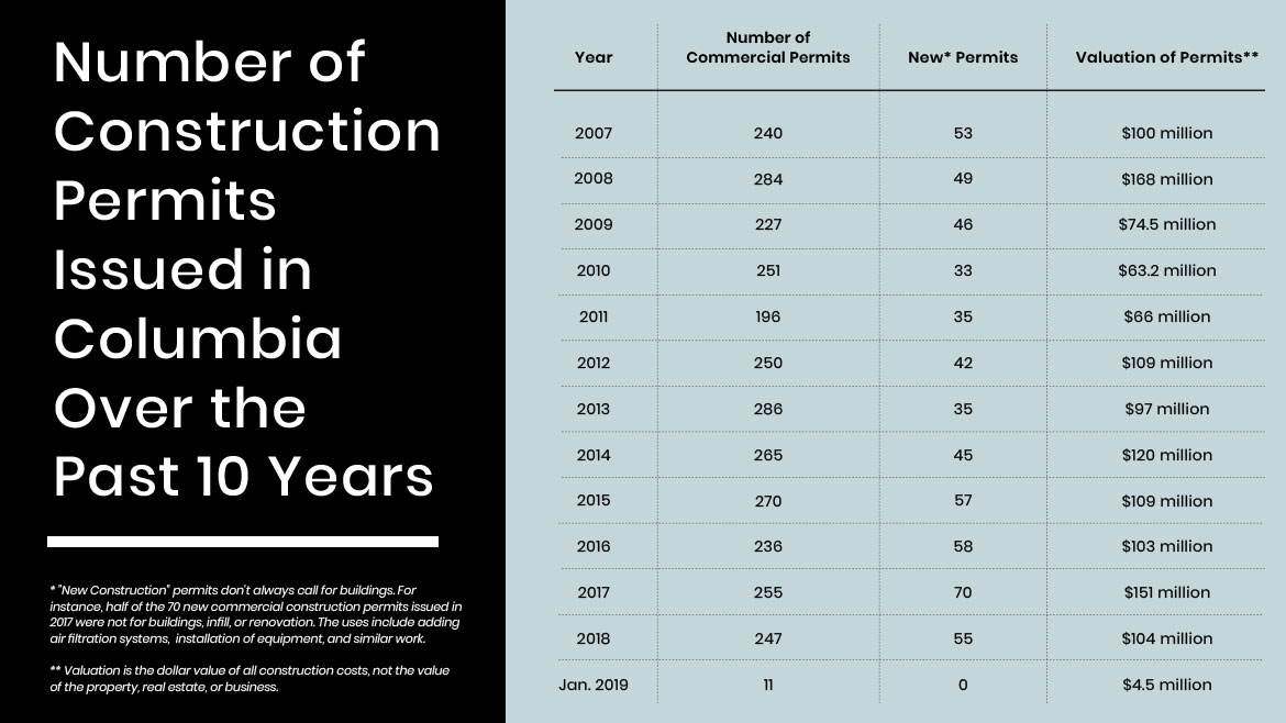 What is the current level of building activity and how does it compare historically — at least to the past 10 years? First, it’s important to realize that commercial construction permits don’t have to be for new construction in order to have sizeable valuations. (Valuation listed on the permit is the value of construction, not the value of the property.) January 2019 passed without any permits for new commercial construction, but one of the 11 commercial alteration permits issued is for an addition to the PepsiCo production plant on Route B in north Columbia. The construction valuation: $2.3 million.