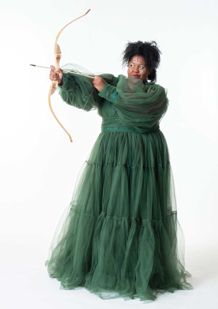 She is pictured here in one of her favorite costumes. It was inspired by nature because the film fest that year was entirely outdoors. When she chose the dress, she saw similarities in Greek goddesses, and Artemis was the perfect fit. From there she had only one question: