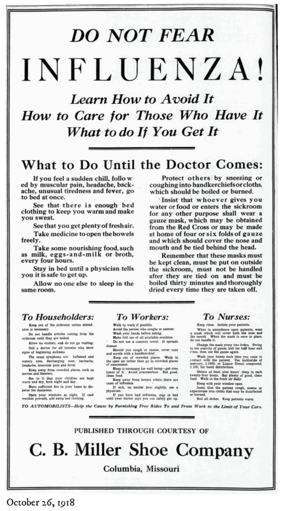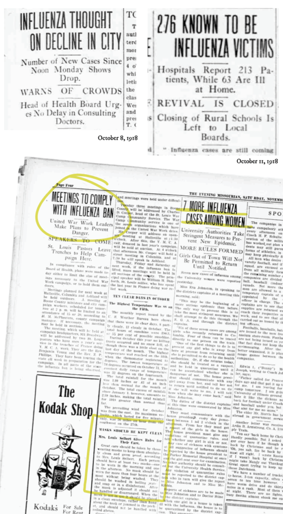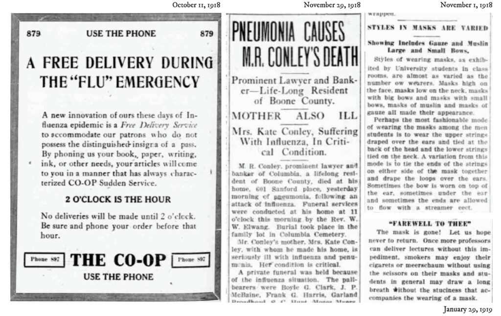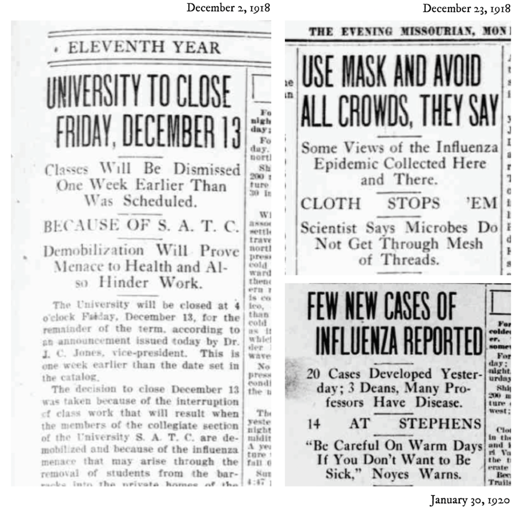 “We initially found old newspaper databases through the Missouri State Historical Society,” Carolyn says. “We have a newspaper that’s been running the entire time. It was called The Evening Missourian at the time, and it was published five or six days per week, and you can read each issue. I started doing some searches to try to see what the flu was doing here in town.”
