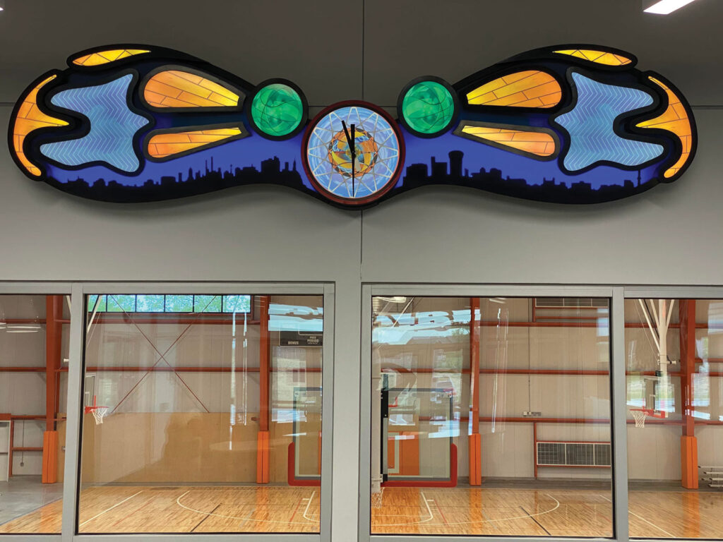 Columbia Sports Fieldhouse, located in A. Perry Phillips Park, installed mixed-media artwork in 2019 from local artist David Spear.